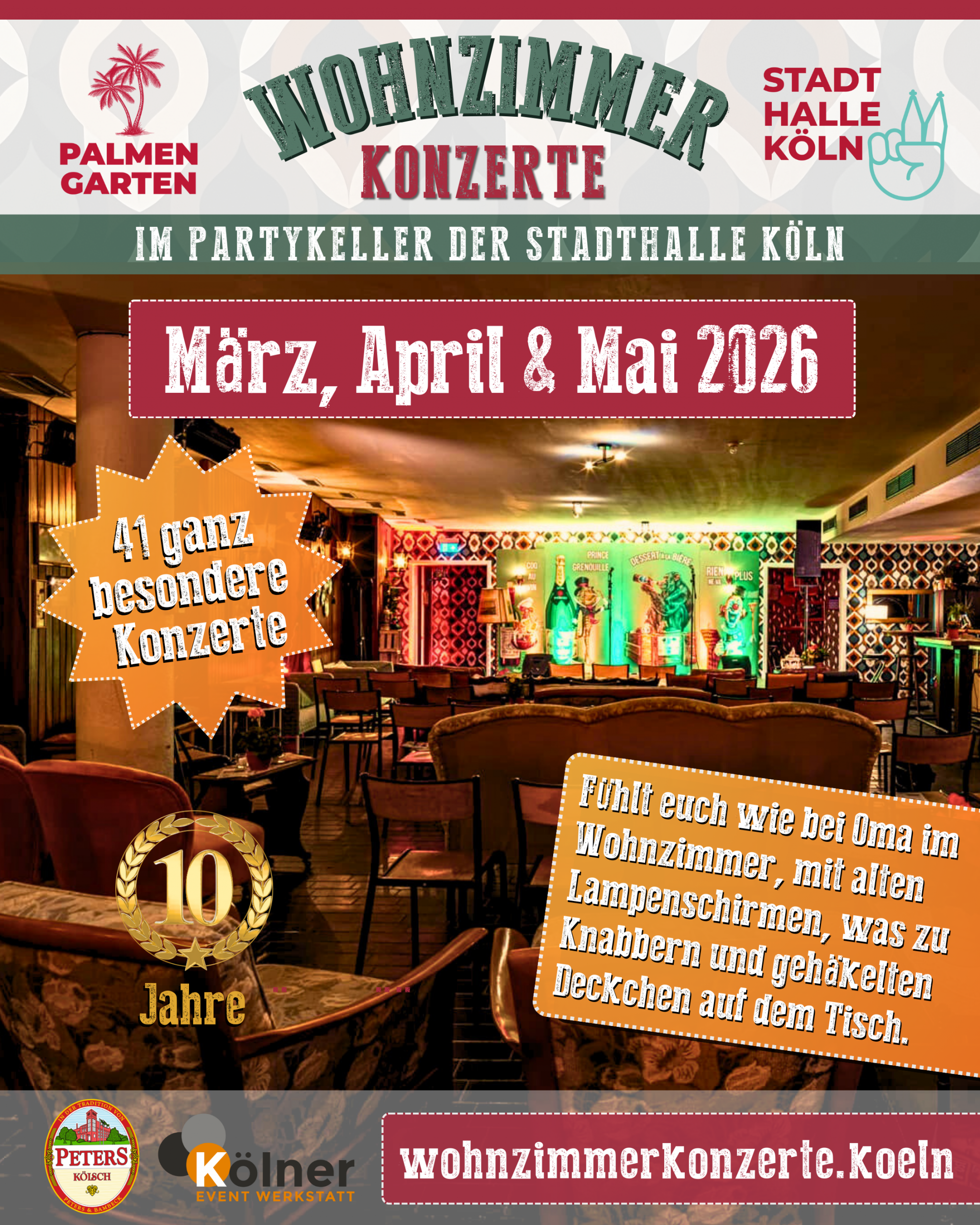 Im saugemütlichen Keller von Palmengarten und Stadthalle Köln findet ihr bei jedem Konzert euren Lieblingssitzplatz, es leuchten viele Kerzen, kleine Tische halten eure Getränke fest und der liebevolle Service bringt euch kleine Speisen an den Platz. Fühlt euch wie bei Oma im Wohnzimmer, mit alten Lampenschirmen, was zu knabbern und gehäkelten Deckchen auf dem Tisch.